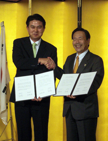 在日同胞が縁結び 【岡山】岡山県(石井正弘知事)と慶尚南道(金台鎬知事)との友好交流協定調印式が17日、岡山市内のホテルで行われた。両知事は、文化、経済など各分野の交流を推進することを誓いあい、それぞれ協定書にサインした。 両自治体の間を取り持ったのは、民団岡山本部(金英雄団長)と同アジア国際センター(金昌男代表理事)。民団は0...