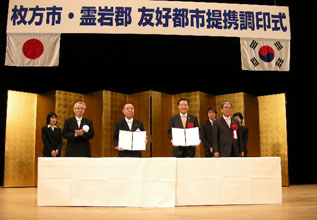 王仁博士が縁結び役 市民団体の草の根交流で 【大阪】日本に論語と千字文を伝えたといわれる王仁博士が取り持つ縁で大阪府枚方市は1日、韓国の全羅南道霊岩郡との間で友好都市提携を結んだ。調印式は枚方市市制施行60周年を記念して枚方市民大ホールで行われ、市民1200人が見守った。 式典に合わせ霊岩郡から金逸太郡守と申樂鉉...