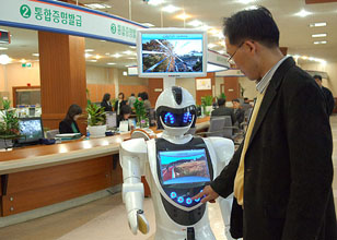 京畿道城南市の寿井区庁に案内用のロボット「Ubi」が今月初めから配属され、庁舎を訪れる区民らに好評だ。案内ロボットの配属は自治体で初めて。案内のほか、ゲームや体脂肪検査、写真および動画像撮影のサービスなども行っている。 (2007.12.20 民団新聞)