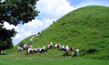 慶州(慶尚北道)皇南洞の大陵苑には、有名な天馬塚をはじめ23基の大きな古墳が保存されている。秋夕(旧盆、今年は25日)を前に、ごらんの通りの草刈りが行われた。周囲100㍍を超すものが多いだけに1基ごとに数十人がかりだ。 (2007.9.26 民団新聞)