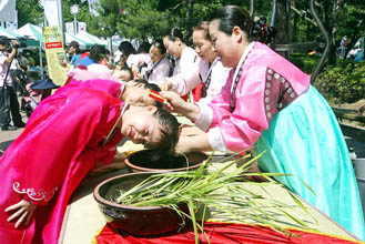 19日は旧暦の5月5日。端午の節句だ。ソウル市内の城東文化広場では「端午民俗祝祭」と銘打って、菖蒲につけた水で髪を洗うイベントが行われた。昔から菖蒲の香気が邪気を払うといわれ、端午にこの水で髪を洗えば、厄難を払い、髪が美しくなると伝えられてきた。 (2007.6.27 民団新聞)