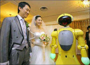 ロボットが司会を務める珍しい結婚式が17日、大田市で行われた。世界でも初めての試み。司会をしたのはハヌル・ロボティクス社が製造した「ティロ」君。「本日の司会を務めるティロです」と切り出し、新郎新婦を紹介した。また、他のロボットも出席者の案内役を務めるなどの役目を果たした。ロボットの価格は約2億ウォン。 (2007.6.27 民団新聞)