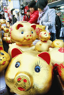 「2007年は黄金ブタの年」と言われ、ソウル市内でも黄金ブタの形をした貯金箱がよく売れている。韓国占い師協会では「黄金ブタの年は俗説だ。丁亥年(07年)は熱い火を意味するので、黄金色よりむしろ赤い色に近い。明るいという意味が『黄金』に変わり広がったのではないか」と説明する。ただし、易術では亥年の中で丁亥年がもっとも良い年とされ、少子化傾向が一時的に解消する...