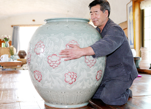 青磁作家・尹ドヒョン氏が制作した「青磁象嵌唐草文壷」が1億ウォンで販売された。高さ1㍍、外周3.2㍍の超大作。全羅南道の康津郡で開催された「青磁文化祭・特別展示会」に出品したもので、韓国人が購入した。 (2006.11.15 民団新聞)