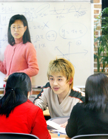 北韓を脱出した青少年のためのフリースクール「ハヌルクム(空の夢)学校」が、2年連続して大学進学率100%を達成した。昨年、大学入試志願者7人全員が合格したのに続いて、今年も7人全員が合格証書を手にした。写真は、今年、ソウル芸術大学・映画科に合格した金さん(22)がソウル市松坡区可楽洞にあるハヌルクム学校で脱北女学生らに数学を教えている。 (2006....