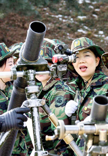 首都圏で初めて創設された京畿道城南の女性予備軍。その隊員らが訓練中に迫撃砲の照準鏡を見ている。同予備軍は3個小隊規模で、年1回4時間の訓練を受け、戦時には戦闘支援任務を遂行する。 (2006.1.18 民団新聞)