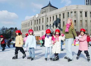 市庁前のソウル広場スケートリンクが9日、新装オープン、子どもらが初滑りを楽しんだ。リンクの幅を10㍍広げ、30×50㍍にし、温風器を備えた休憩室も設置した。スケート靴とヘルメットをあわせたレンタル料は2時間1000ウォン。身障者や65歳以上、恵まれない家庭の子どもらは無料。 (2005.12.14 民団新聞)