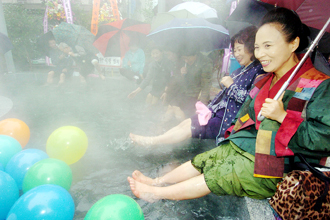 釜山市東莱区温泉洞に露天足湯が11日、オープンし、市民らが気持ちよさそうに足をひたしている。韓国では初めて。直径7㍍の広さで、50人余が利用することができる。無料サービスで、観光客寄せに期待されている。 (2005.11.16 民団新聞)