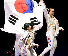 ドイツ・ライプチヒで行われた世界フェンシング選手権大会女子フルーレ団体戦決勝で14日、韓国は延長戦の末、ルーマニアを20ー19の逆転で下し初優勝した。韓国のチョン・キルオク、ソ・ミジョン、イ・ヘソン、ナム・ヒョンヒ選手が太極旗を掲げながら会場を回っている。 (2005.10.19 民団新聞)