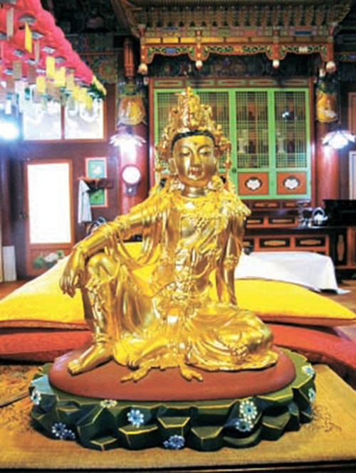 大韓仏教曹渓宗はこのほど、ソウル城東区の弥陀寺金宝庵で国立中央博物館が所蔵するものときわめてよく似た金銅観音菩薩坐像(写真)を発見したと17日、明らかにした。 高麗後期から朝鮮朝初期の間に製作されたものと推定される。高さは35㌢で、右膝を立てて座り右手を膝の上に置き、左手で床に手をついて支えている「輪王坐」姿の仏像。