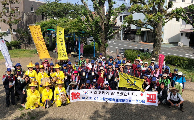 【静岡】民団静岡本部(李宜弘団長)は14日、静岡市内の安倍川橋に民団の農楽隊を繰り出し、「第7次21世紀の朝鮮通信使ソウルー東京友情ウオーク」一行の到着を歓迎した(写真)。県本部会館前では李団長ら多くの役員、団員が出迎えた。 韓国の広州からウオーカーに加わったナ・ヨンエさんは「農楽隊の音に感激した」と涙を流した。ソウルから参...