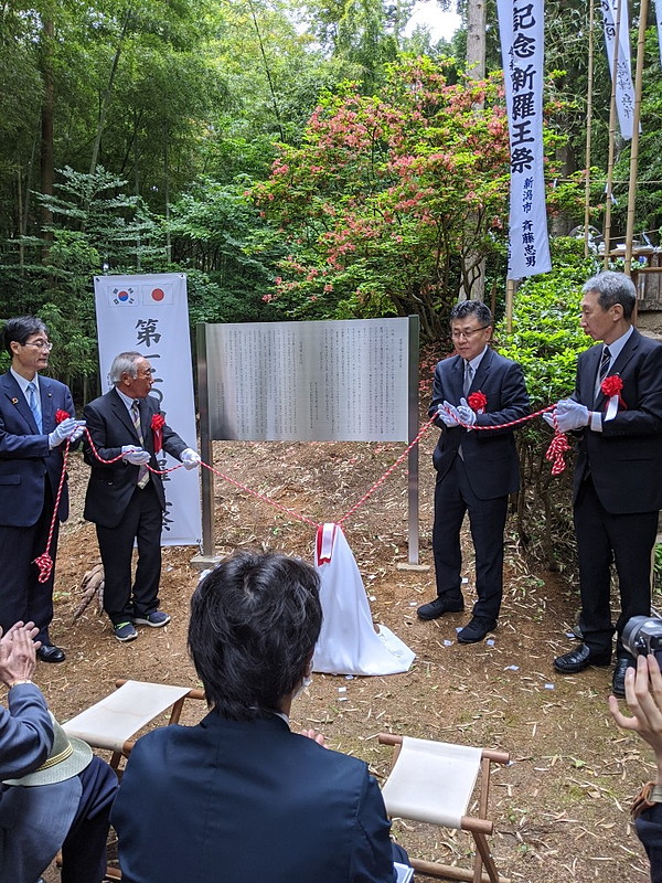 燕・竹ケ花集落 住民が祭礼続け120年 【新潟】800年前、韓半島から漂着した「新羅王」が住みついたとの言い伝えがある燕市中島の竹ケ花集落に、民団新潟本部(鄭和仁団長)が韓日友好を願い、伝承を紹介する2カ国語の案内看板を設置。12日、「新羅王」をしのぶ祭礼でお披露目された。祭礼は「新羅王」の遺徳をしのぶ地元住...
