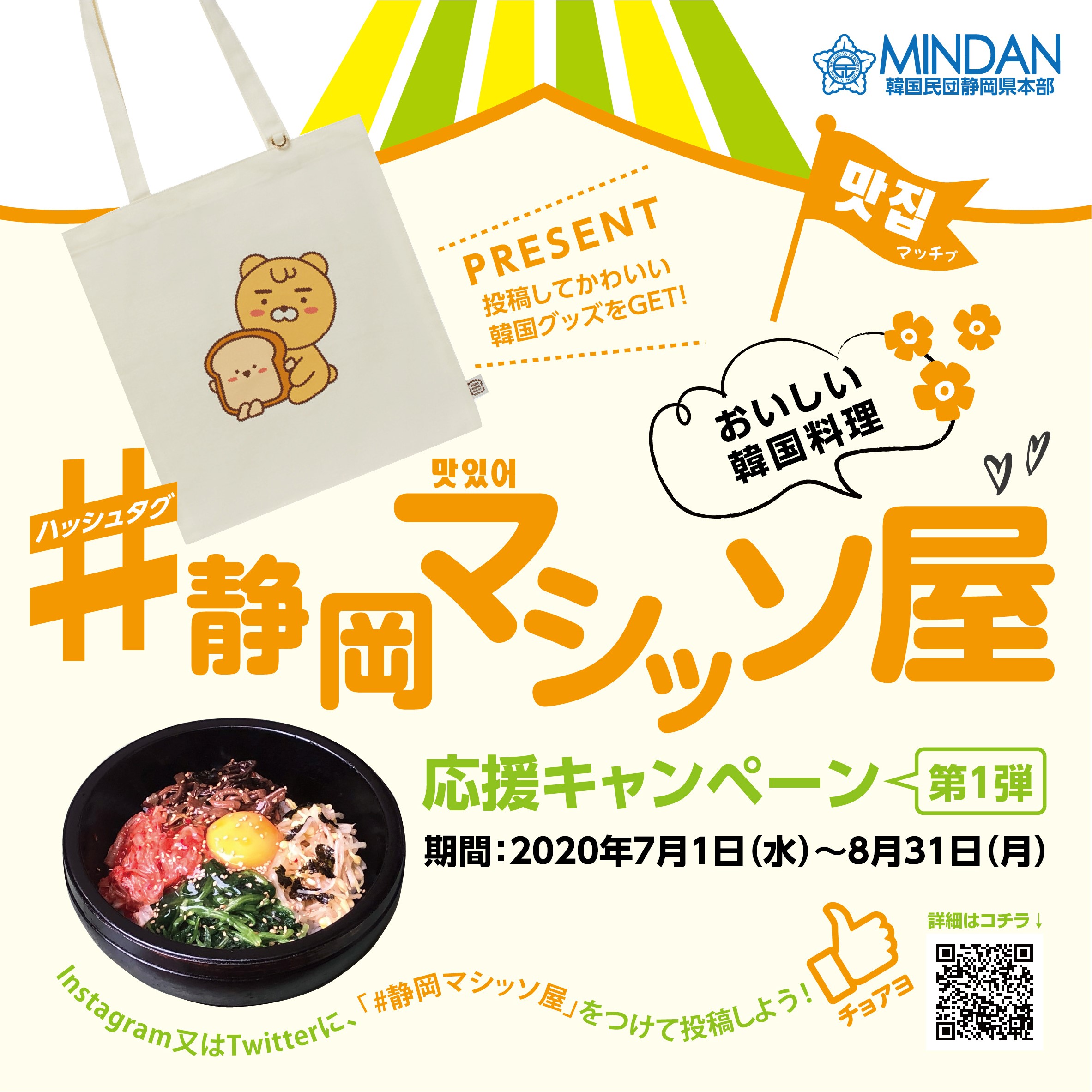 SNSで写真投稿呼びかけ 34店舗が協賛 【静岡】民団静岡本部(李宜弘団長)は1日からSNS写真投稿キャンペーン「#静岡マシッソ屋」第1弾をスタートさせた。 市民に所定の韓国料理店でお気に入りの料理を写真に撮ってもらい、SNSに店舗名や位置情報とともに「#静岡...