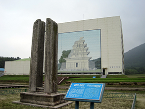 薯童謡への興味に惹かれ、扶余から益山市の近郊、弥勒寺址へと足を伸ばした。発掘調査が進行中と聞いてきたが、大きな格納庫がまずは目につく。覆いの中で石塔の解体補修作業が行われているのだ。側面に描かれた絵で、解体前の姿が窺い知れる。 『三国遺事』が語る薯童伝説の後半‐。武王と王妃(善花公主)が獅子寺詣でに龍華山の麓まで来た時、池から弥勒三尊が...