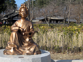 雪景色を車窓に見ながら大関嶺の峠を越えた。やがてバスが下る道の彼方に海が姿を現し、その手前に鏡のように光る水の広がりが見えてきた。江原道江陵市の鏡浦湖。景勝地として有名なこの湖のほとりに、最近とみに注目を集める歴史スポットがある。 朝鮮中期の女流詩人、許蘭雪軒(1563〜1589年)の生家。朝鮮初のハングル小説『洪吉童伝』を書いた弟の許筠...