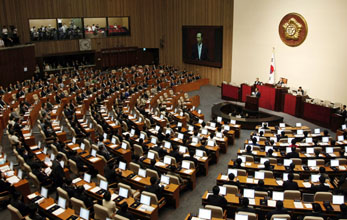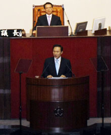新国会開院演説で強調 李明博大統領は11日、米国産牛肉の輸入再開問題を発端にした社会的混乱のなかで、1カ月以上の空転を経て開院した第18代国会で施政演説を行い、「今後5年が決定的に重要な時期」だと強調、「一致団結して内憂外患を克服し、先進一流国家実現へともに前進しよう」と議員、国民に呼びかけた。 堂々の強国めざす 先進化は時...