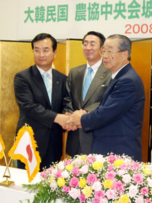 【神奈川】京畿道の韓国農協中央会坡州市支部(呂相弓支部長)は10日、神奈川県秦野市農業協同組合(松下雅雄代表理事組合長)との「友好農協提携意向書」に仮調印した。この日の仮調印式は古谷義幸秦野市長出席のもと、秦野市農協本所で行われた。 坡州市からは呂支部長を筆頭に、地域農協の組合長ら14人が参加した。古谷市長が「両市農民の文化、技術の交流を期待する」...