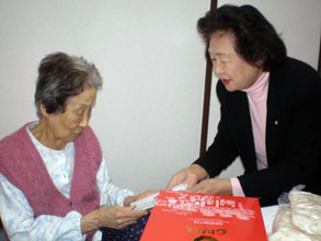 【大阪】婦人会中央本部(余玉善会長)の創立60周年を記念した功労者慰問活動が各地で続いている。3日には余会長が、大阪の順姫さん(94、元中央本部会長)宅を訪ね、記念品とトックなどを手渡した。