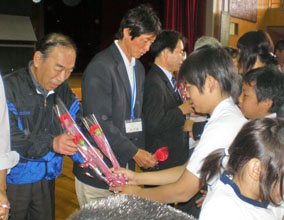 この日は小・中・高等学校の全生徒が講堂に集まり、日ごろの感謝の気持ちをこめて教職員らにカーネーションを手渡した。