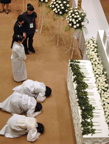 第2次大戦中に犠牲となった韓半島出身の軍人・軍属の遺骨44体が9日、東京都目黒区の祐天寺から60余年ぶりに韓国・天安にある「望郷の丘」に安葬された。日帝強占下強制動員真相糾明委員会(金龍鳳委員長)が国内の遺族を捜し出したことで、日本政府からの奉還が実現した。軍人・軍属に限れば、昨年中の2回にわたる160体と合わせ、今回3回目の奉還で計204体が遺族のもとに戻ったことになる。