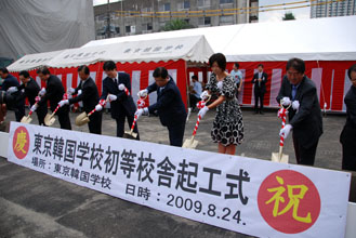 東京韓国学校(金明植校長、新宿区若松町2‐1)は24日、初等部校舎の横で増築工事起工式を行った。権哲賢駐日大使をはじめ、民団中央本部から呉公太・金昭夫両副団長、民団東京本部から李時香団長が出席した。