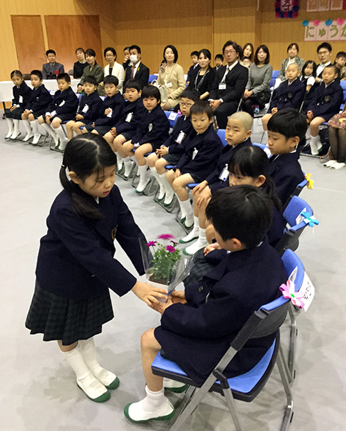 [ 新入生(左)のために花束を用意した在校生=金剛小学校 ]