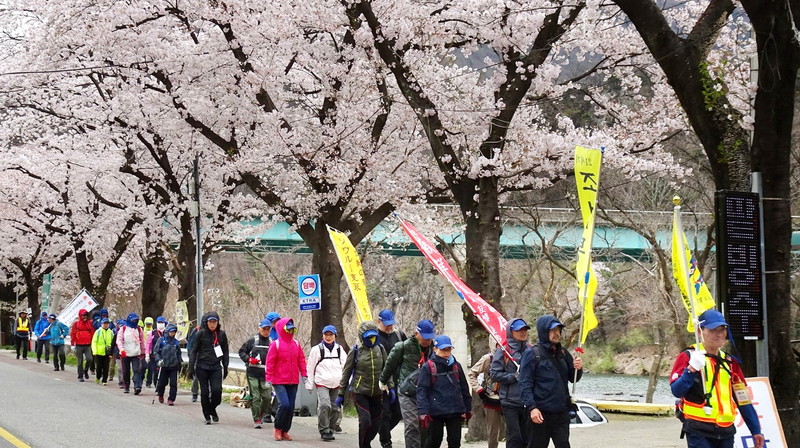 【8日目】(水安堡温泉~聞慶22㎞)今日は韓国コース最大の難所の峠越え。地方道とバイパスのゆるやかな上り道を過ぎて、山道へ。まだ「冬景色」の茶色い木々の間を1時間上り、標高561㍍の鳥嶺峠にたどり着く。文禄慶長の役の後に出来た石造りの「第一関門」を聞慶側に抜けると草原が広がっていた。古道の雰囲気が残る道を下ると満開の桜並木が待っていた。夕食では峠越えを祝い、サムギョプサルを食べて疲れを癒した。