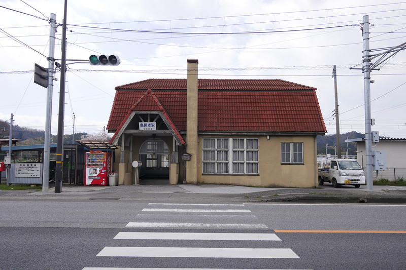 「鳥居本」駅は、1931年(昭和6年)に建設。何度か建て替えられたが、赤い腰折れ屋根の建築様式は、今も健在である。