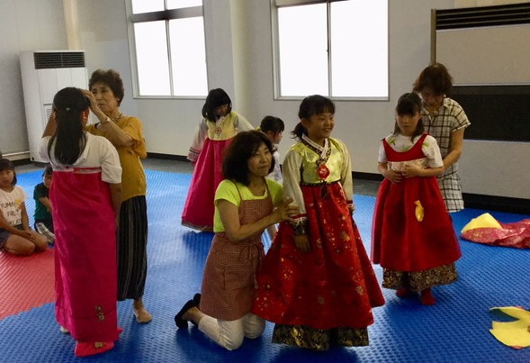 終了後、オリニたちは本部会館に移り、婦人会三重本部(崔美代会長)の世話で韓服に着替えると、梁玹碩事務局長から韓国式の礼(チョル)の仕方を学んだ。殷団長は「これからも趣向をこらして10回、20回と継続していき、団員との交流を深めていく」と話していた。