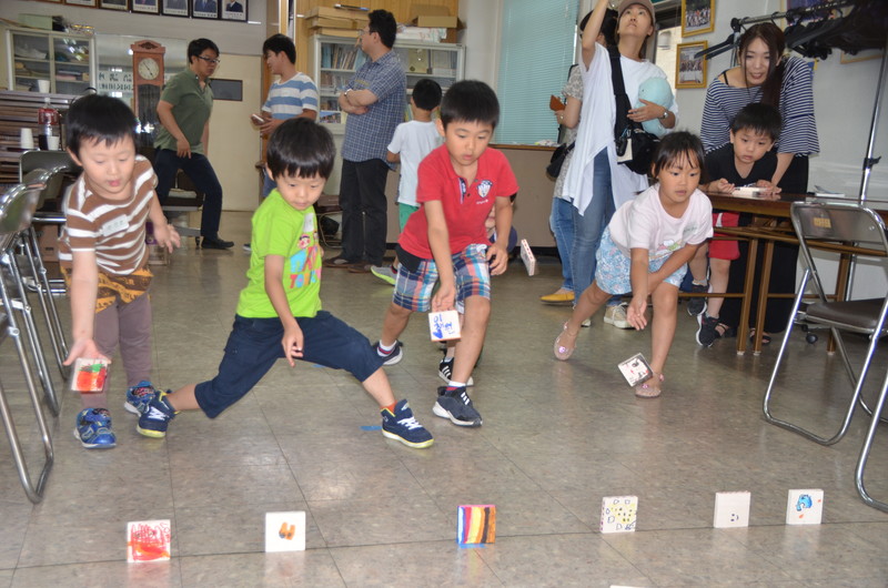 次に保護者も加わり「カンガンスルレ」の一部を全員で歌い踊った。ここでも歌詞には「ナムセンギ」が登場し一貫性を保った。最後は昔ながらのピソックチギ(石飛ばし)を楽しんだ。石はフェルトペンやクレヨンで彩色をほどこした正方形の建材。標物にあたると「オッシー!」と飛び跳ねて喜びを表現していた。