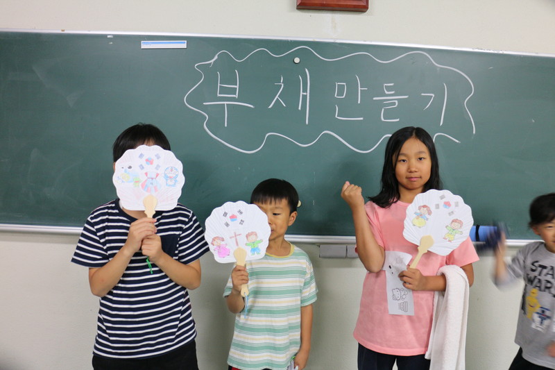 子どもたちは韓国語の言葉合わせに取り組み、韓国の童謡に合わせて舞踊を学んだ。その後は親子水入らずでミニ運動会に興じ、夕食後も団扇に韓国関連の模様を自由にデザインして楽しんでいた。