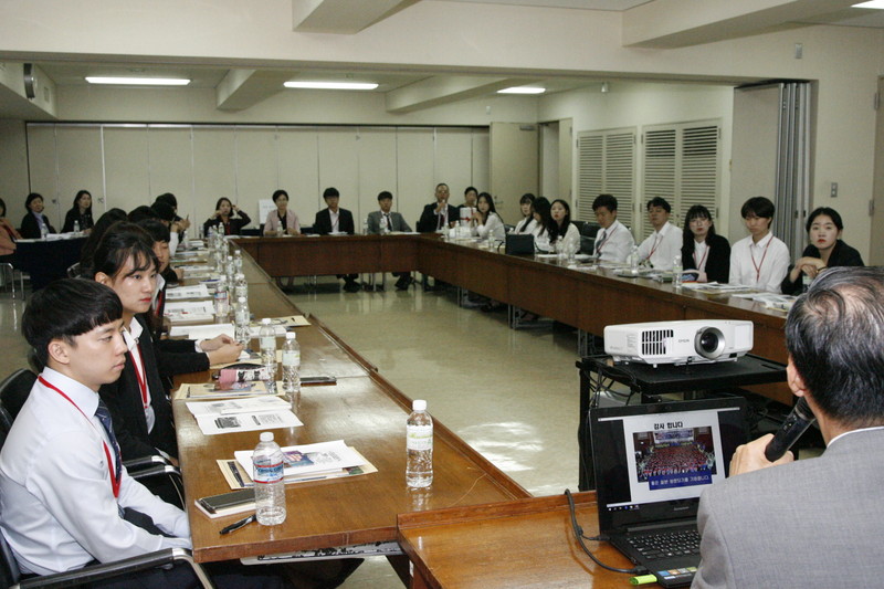 [ 学生たちにブリーフィングする民団中央本部の鄭夢周副団長 ]