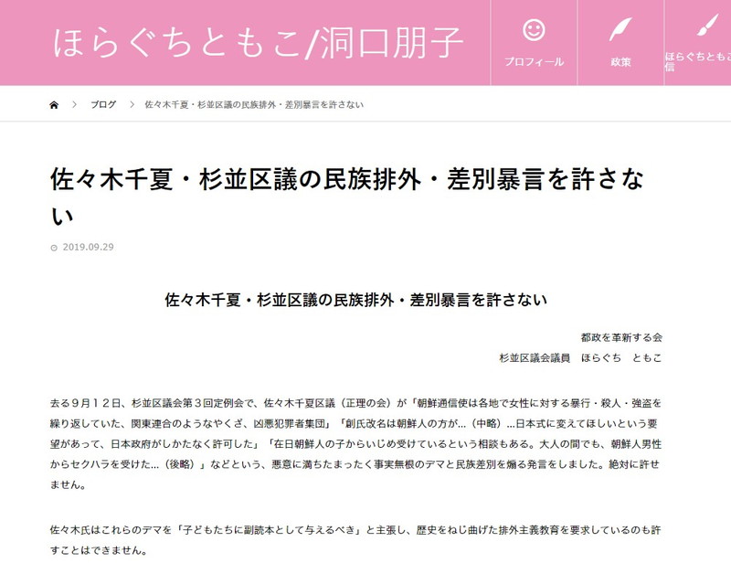 洞口朋子同区議(都政を革新する会)は9月26日、「民族排外・差別暴言を絶対に許せない」とするコメントを発表した。