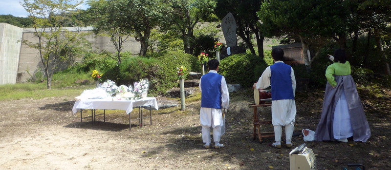 【鳥取】民団鳥取本部(黄龍也団長)は9月10日、同胞と日本人の犠牲者65人を祭る岩見町荒金地区旧鉱山供養塔前で儒教式祭祀(慰霊祭)を執り行った。