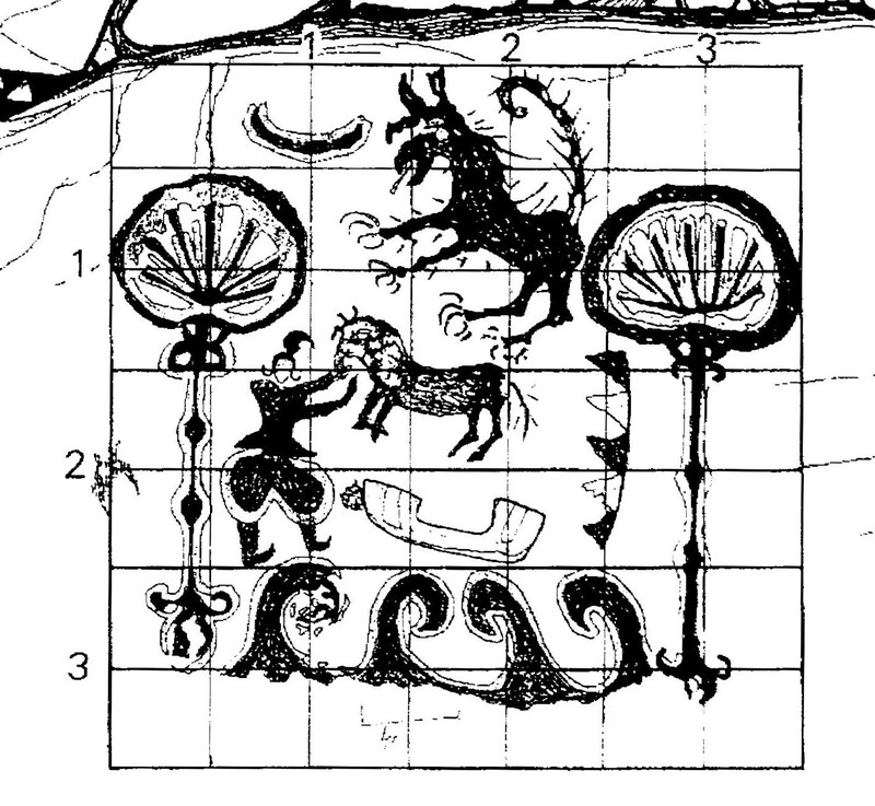竹原古墳の壁画にも試してみると、馬や人などの各アイテムがこの方眼上に割り付けられていた。他に型紙の技法もみられ、ダイナミックなこの壁画は、実は道具や器材を使った職人芸の作品であるとわかったそうだ。