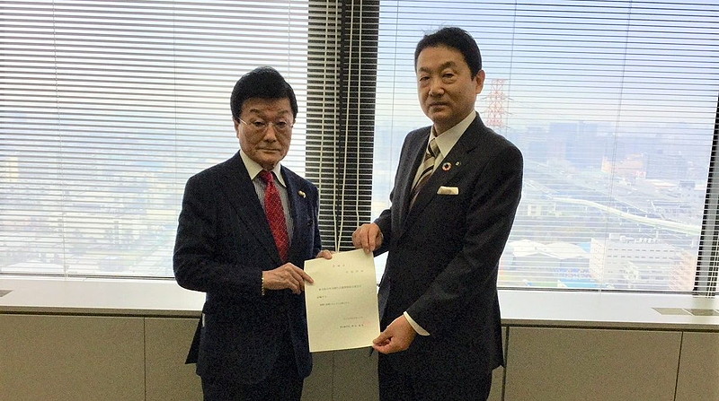 [ 委任状を手に呉龍浩座長(左)と野田義和市長 ]