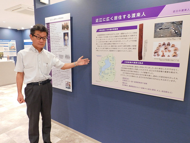 かつて「近江国」といわれた大津市とその周辺は、古代からほぼ全域に渡来人が住んでいたゆかりの土地。古代から現代までを一つの流れとして渡来の歴史を平易な言葉でパネル展示したのは従前どおり。今回は新しい知見を取り入れて、渡来した人や文化、国づくりの歴史を掘り下げ、在日韓国人についてもさらに詳しく解説した。