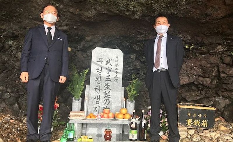 [ 福岡総領事館が設置した祭壇武寧王「生誕記念碑」の前で朴弘正団長(右)と李煕燮総領事 ]