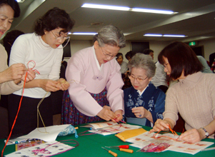 韓国の飾り結び・メドゥプのワークショップが11月26日、関西韓国文化弘報院(金鍾權院長)で開かれ、約60人の主婦たちが参加した。講師の韓国重要無形文化財技能保持者・金喜鎭先生(70)は「韓国のメドゥプの美しさを学んで下さい」とあいさつ。参加者たちはメドゥプの基本的な結び方「トンシムキョル」(同心結=菊結び)を学んだ。参加者たちは「むずかしいがおもしろくて、はまってしまう」と一生懸命取り組んでいた。