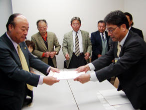 [ 三重県教育委員会に殷鐘秀団長(左)が要望書を伝達(14日) ]