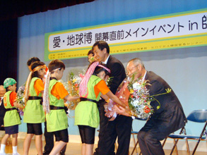 長瀬町長は「韓流ブームで日本のすみずみまでが親しみをもった韓国と手を携え、意義ある万博にしていこう」と呼びかけた。梁東一民団愛知県本部団長も「在日と町民との市民交流の場として心ゆくまで楽しんで下さい」とあいさつした。