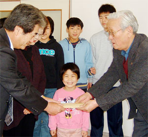 [ 愛神愛隣舎の金理事長(右)にチケットをプレゼントする朴鍾遠民団兵庫副団長 ]