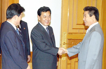 [ 南北長官級会談のため訪韓し、盧武鉉大統領(右)を表敬訪問した北韓代表団=23日、ソウル ]