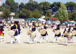 [ 塩浜小運動会で「大農楽」を演じる児童たち ]