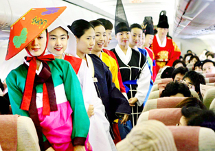 アシアナ航空は9月末から、乗客サービスの一環として、乗務員らによる伝統韓服ファッションショーを始めた。国際線の長距離路線で月2回ずつ行う。写真はテストとして済州行き航空機内で行われたもの。