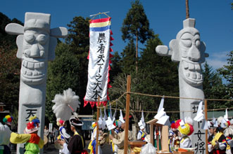 この長丞は慶尚北道禮泉郡の長丞マウルで、彫刻家・金壽浩氏が1本それぞれ8㌧の花崗岩から2カ月かけて制作した。第2鳥居近くの特設スペースに、左に天下大将軍、5㍍の間隔をあけて右に地下女将軍が、地上部の高さ5㍍、直径70㌢の堂々たる風貌で立つ。