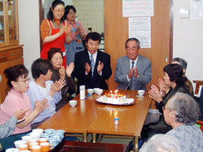 【大阪】民団八尾支部(任龍鶴支団長)の街かどデイハウス「ふれあいの郷・無窮花」が満3周年を迎えた。11日はお祝いのテーブルに赤飯、いつもより色とりどりの材料を加えたチャプチェ、キムチの盛り合わせ、ワカメのミョンテスープなどが並んだ。