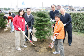同町総合福祉センター「もえの丘」で行われた植樹式には、鄭総領事をはじめ長瀬町長、民団愛知・新西支部の韓基成支団長らが出席。地元の師勝北小学校の6年生とともにスコップを握った。