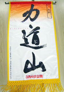 懸賞旗は、映画配給のソニー・ピクチャーズエンタテインメントが土・日曜日の横綱朝青龍戦に出しているもので、力強い字体で「力道山」と書かれている。上部には太陽をイメージする赤のグラデーションが入っており、戦後の日本人に勇気を与えた力道山が太陽のような存在という意味を込めた。