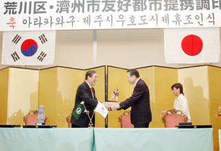 金市長は「荒川区民と済州市民の間でよりおおきな友好と信頼の輪をつくっていきたい」と決意を述べ、西川区長も「今年は済州訪問年であることから大規模訪問団を組織したい」と交流の拡大を誓った。